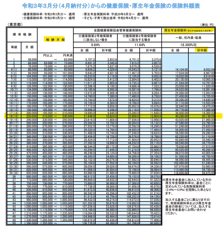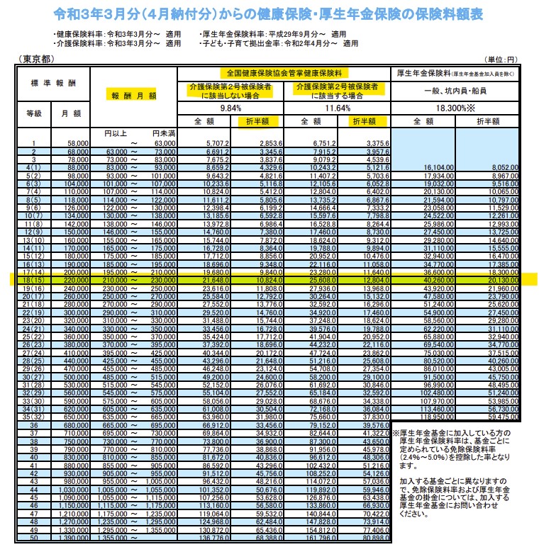▶令和3年3月分(4月納付分)からの健康保険・厚生年金保険の保険料額表 東京都(全国保険健康協会)