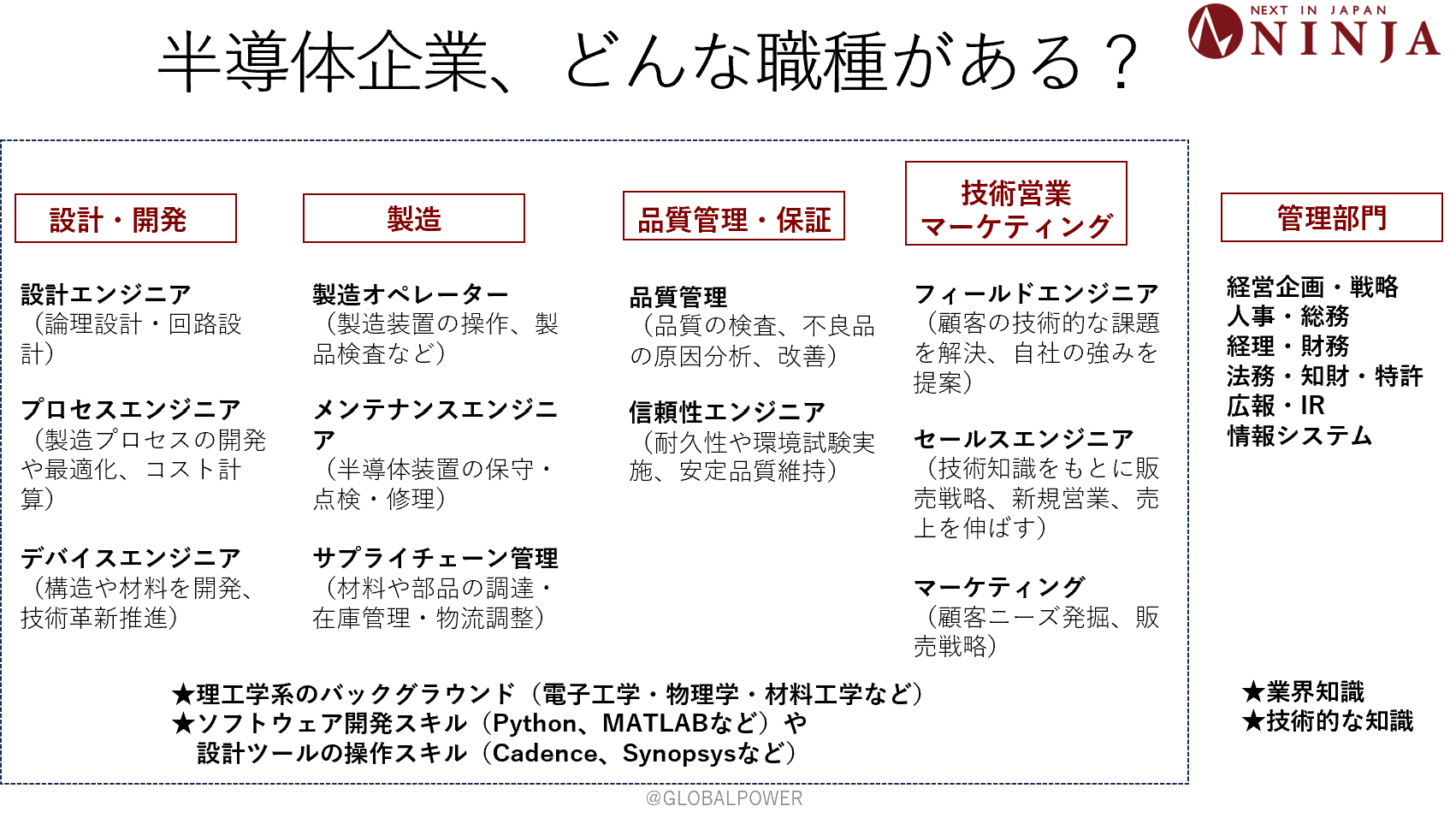 理工学系(電子工学・物理学・材料工学など)のバックグラウンドやソフトウェア開発スキル(Python、MATLABなど)や設計ツールの操作スキル(Cadence、Synopsysなど)がある方は活躍しやすい業界です。また、どこの会社にも存在する管理部門(人事・経理財務・広報IR・法務)などにおいても、業界特有の専門用語や技術を理解しておく必要があります。